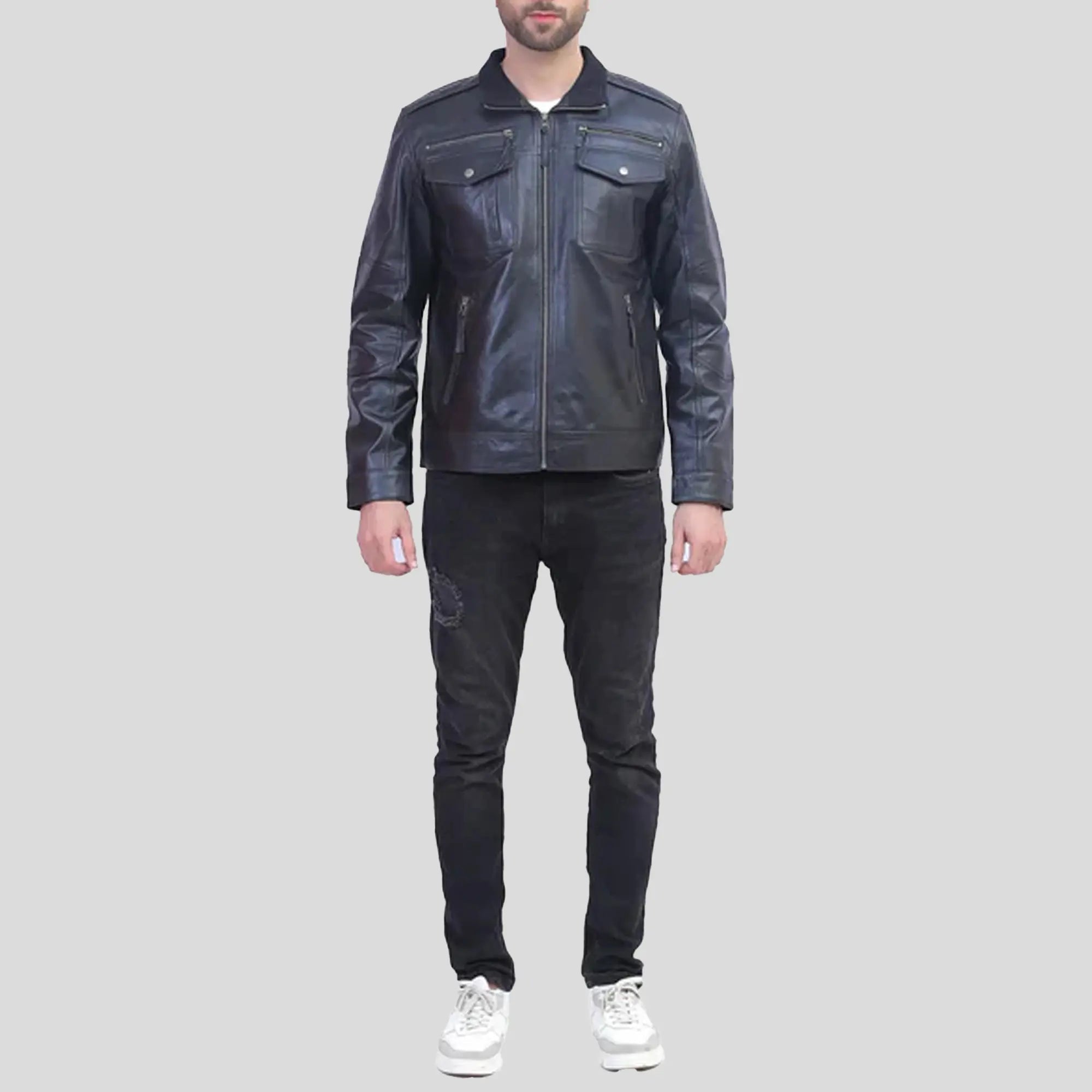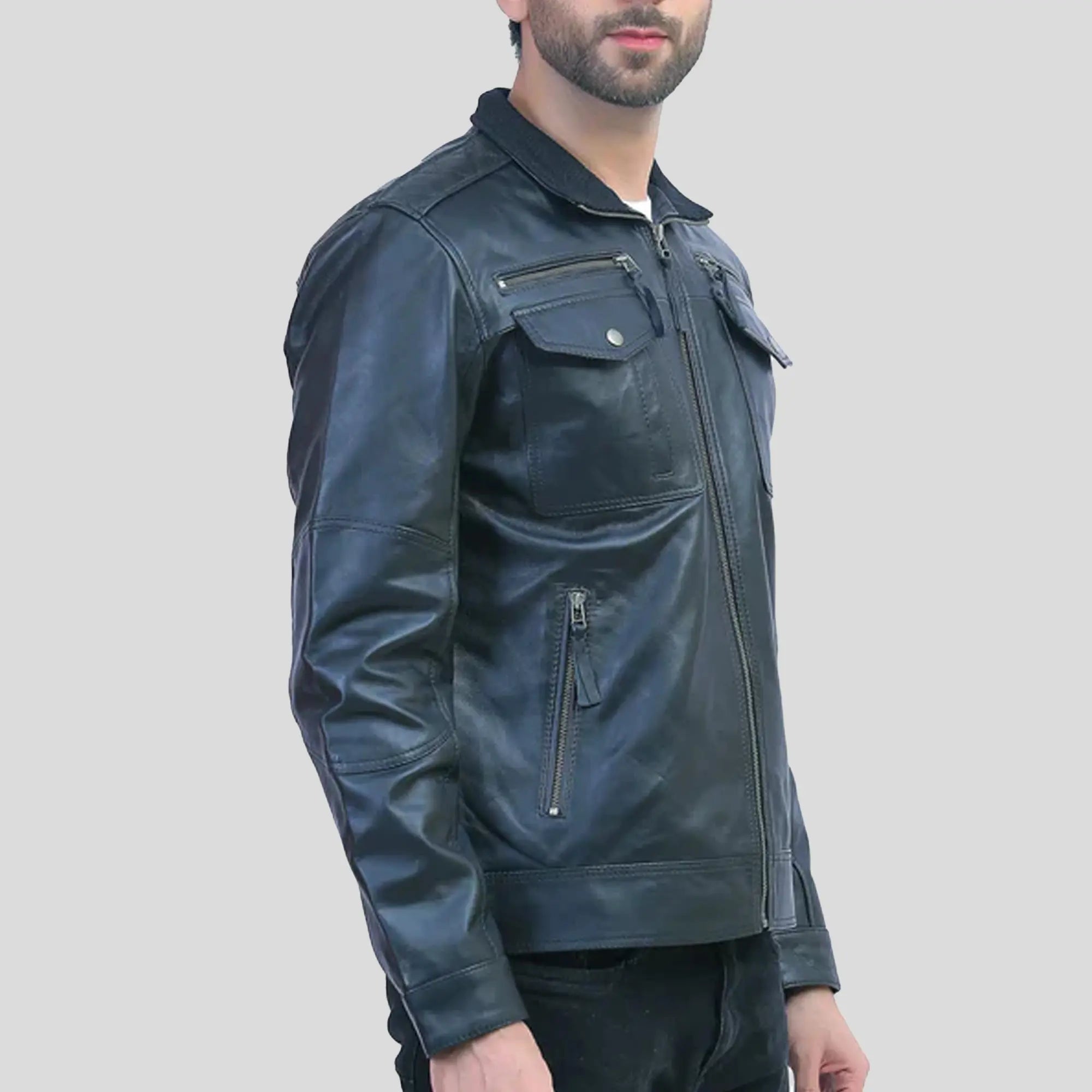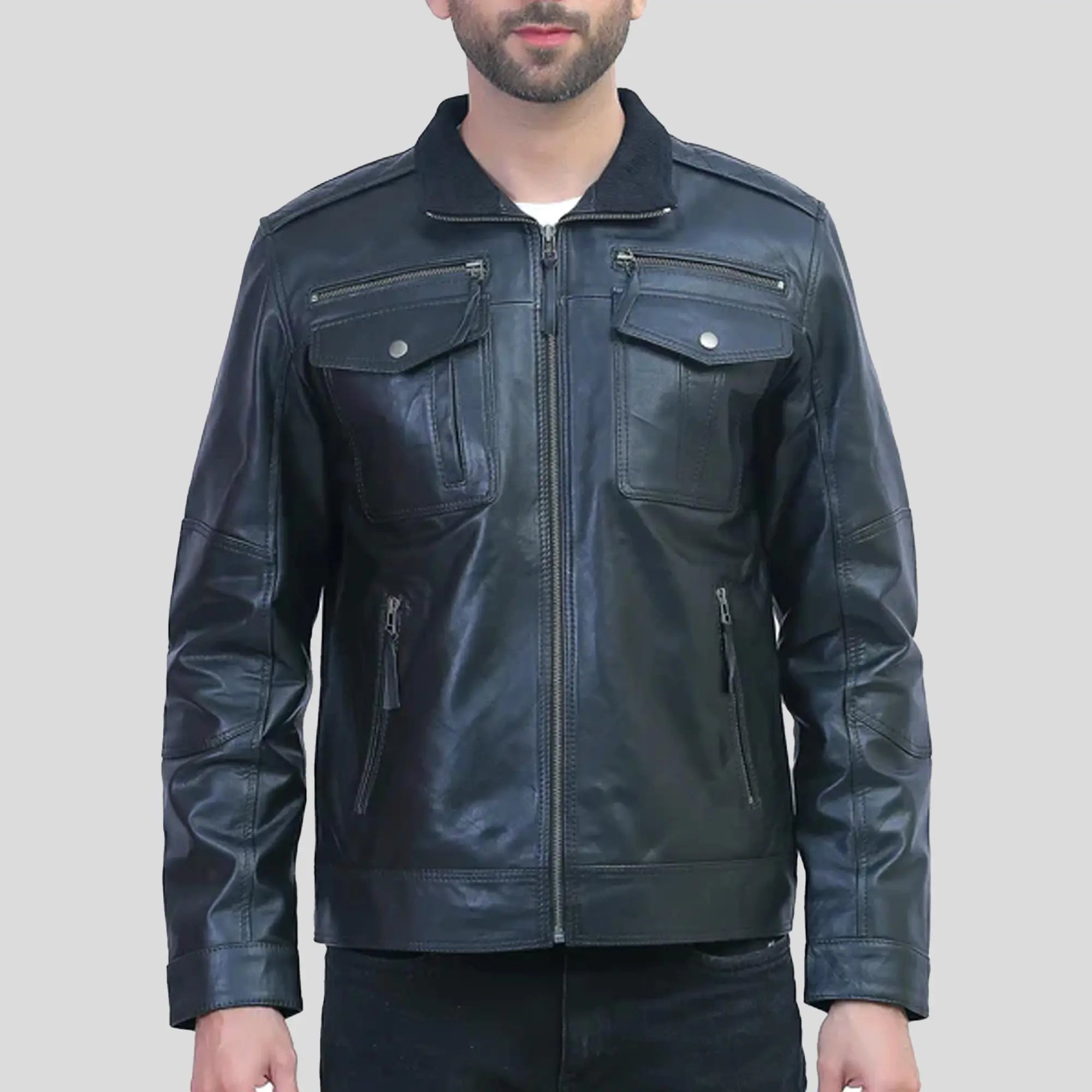 Experience amazing style with the Mens Black Leather Motorcycle Jacket. It is a premium real leather jacket with a shirt-style collar, a convenient smooth zipper closure, and four outside or inside pockets as well. Whether it's the rugged appeal of a classic leather racer jacket or the timeless classic charm of a black leather jacket, this item caters to both with an outstanding combination of functionality and long-lasting quality. This biker jacket is a tailored fit and comfortable viscose lining are the perfect blend of fashion and functionality for riders and trendsetters alike.