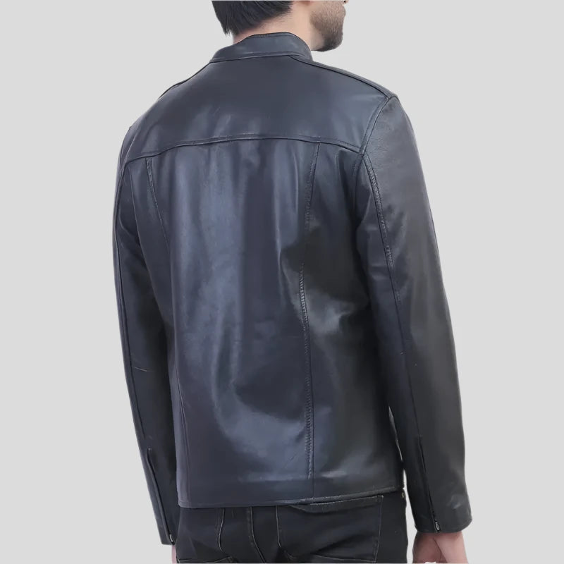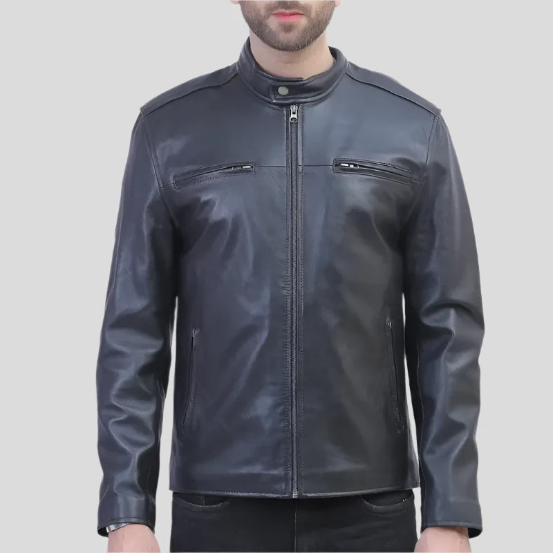 Ride in Style in this  Men’s Black Biker Leather Jacket can ride in style. This jacket is made up of high-grade real leather gives you that bold and classy look. It has a snap-tab collar, smooth zipper closure, and four outside pockets, practical and edgy design. Suitable as a classic cafe racer jacket or a statement Biker Jacket, its inner viscose lining allows you to indulge in easy all-day comfort.