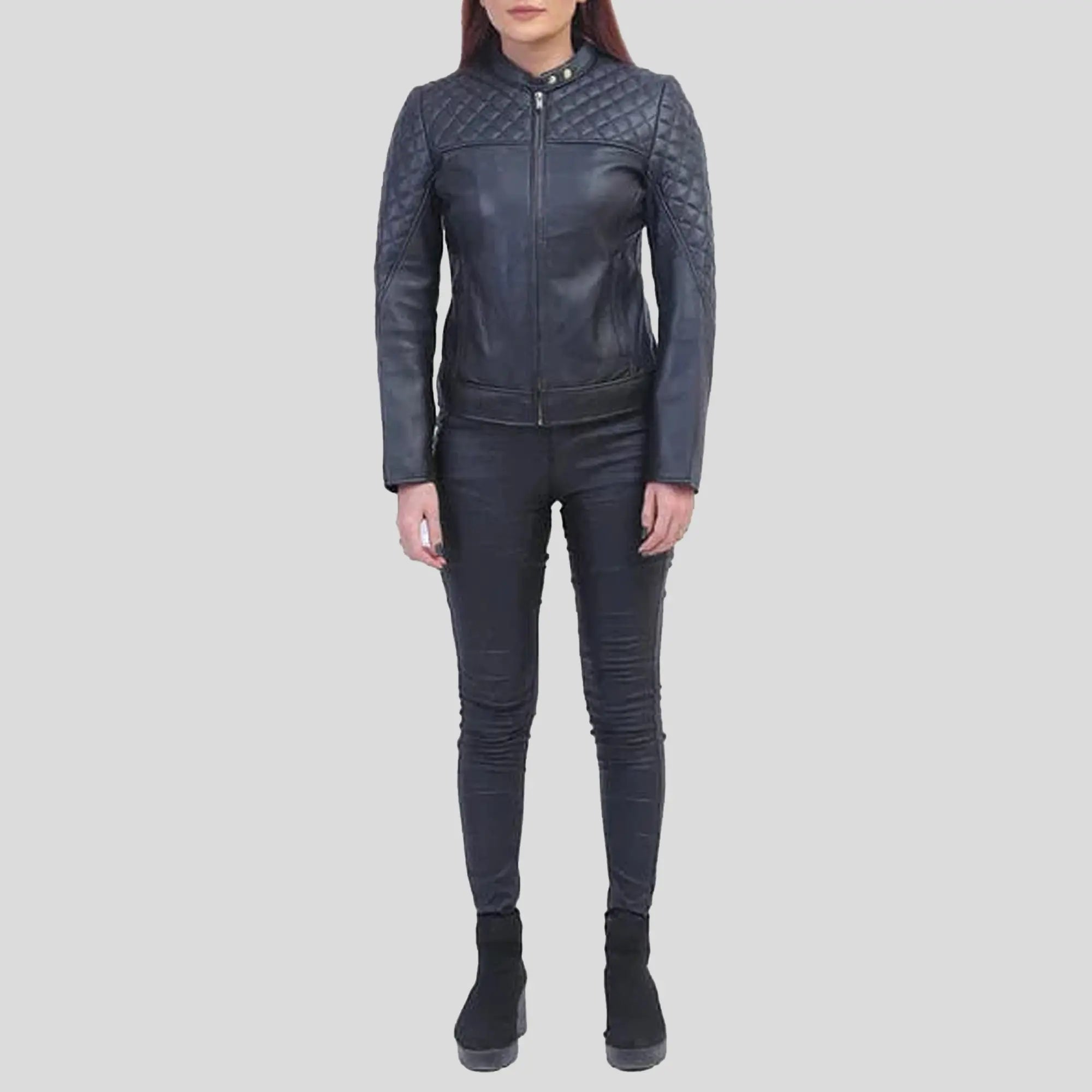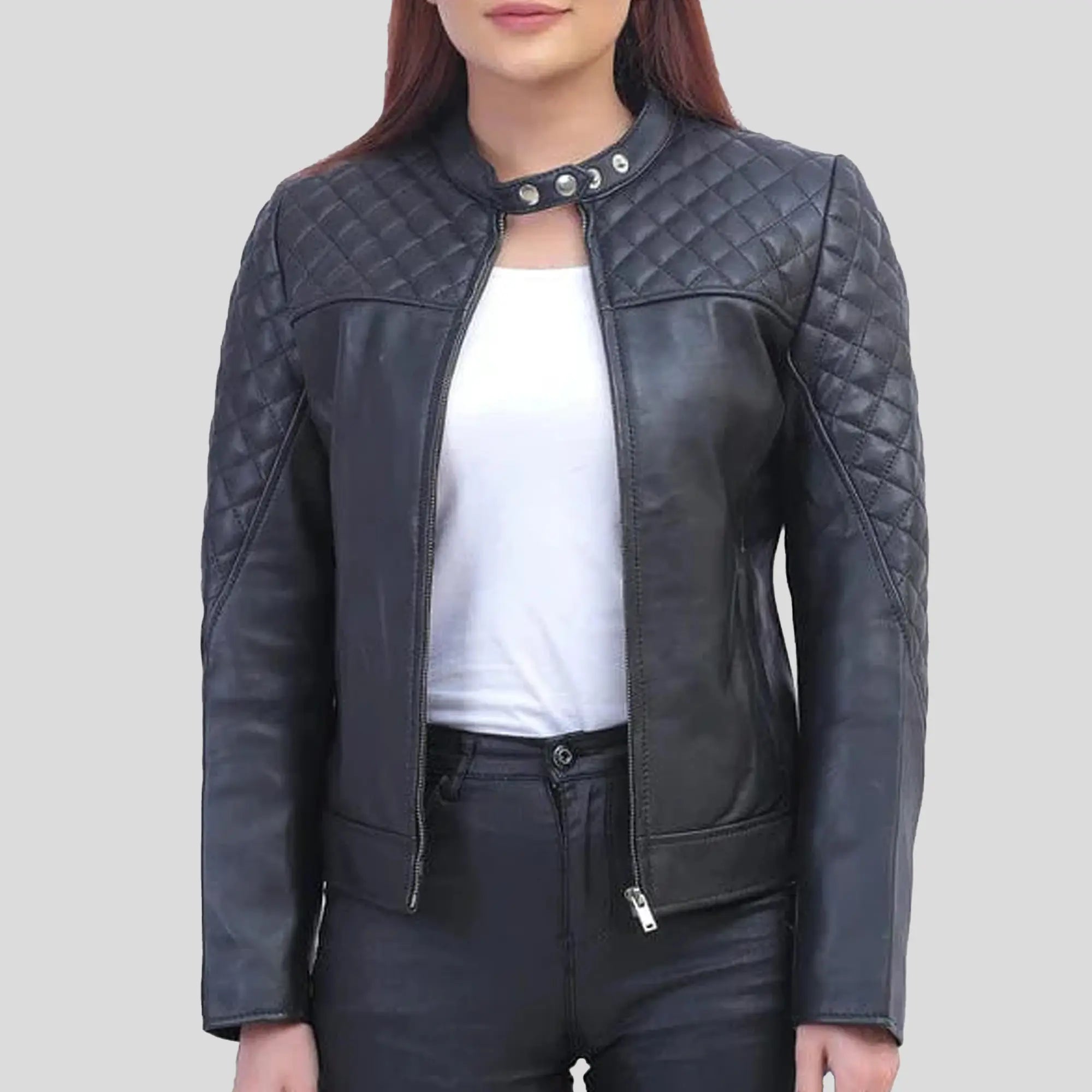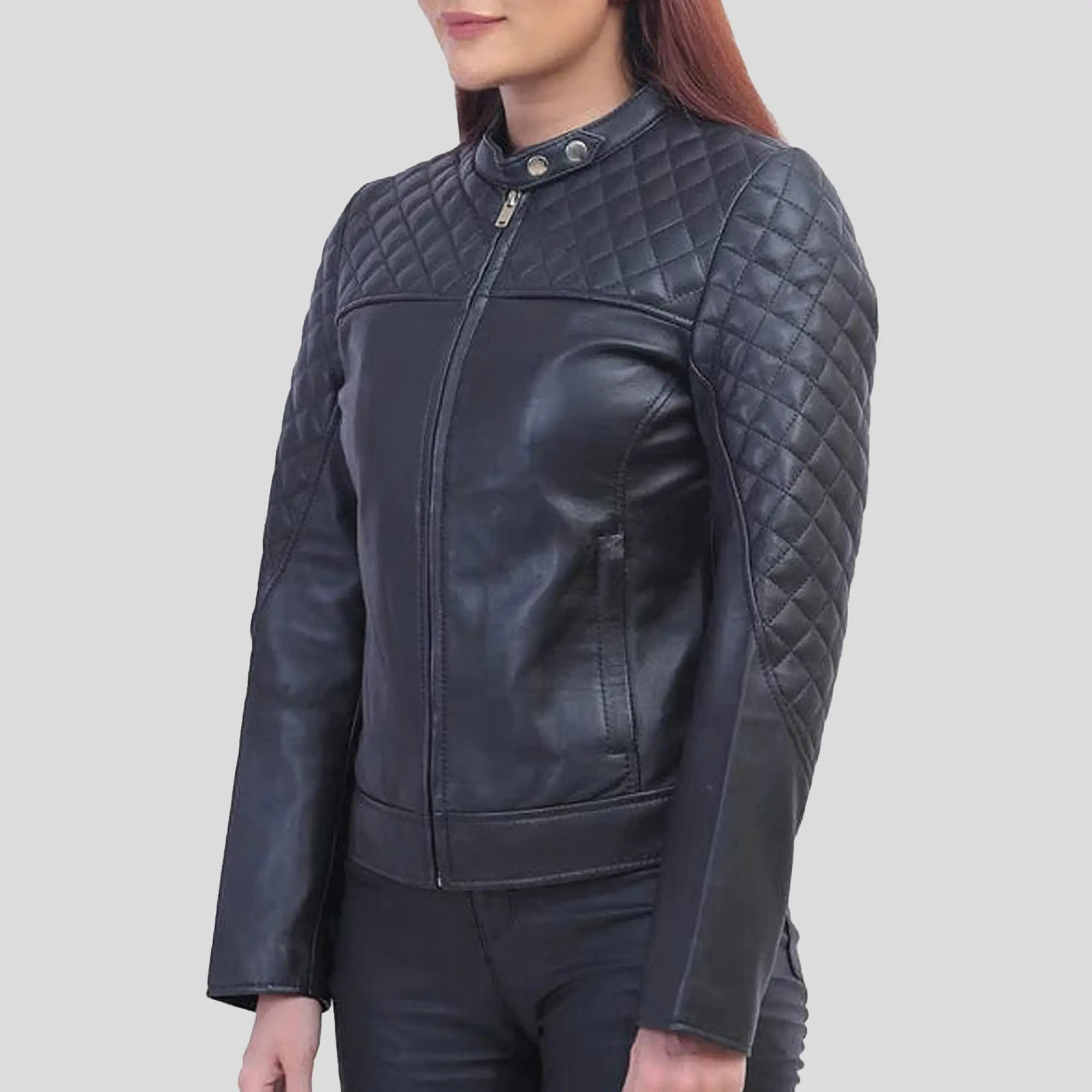 Women's Black Quilted Shoulder Cafe Racer Jacket